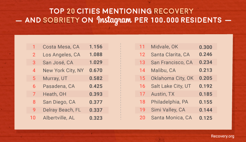Finally, we located the cities from which each sobriety- and recovery-related Instagram post originated and tallied up which have the most per capita posts.